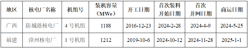 1)漳州核电厂1号机组2024年10月12日装料,本表格中发电量及上网电量数据为调试期间电量,能力因子暂无数据。