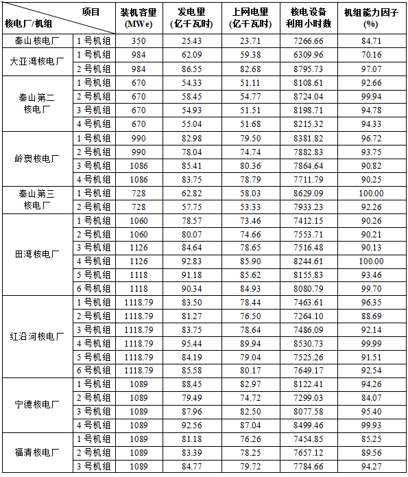 3)本表“合计值/整体值/平均值”中,装机容量、发电量、上网电量为各机组合计值,核电设备利用小时数为全部机组整体值,机组能力因子为全部参与统计机组的算数平均值。