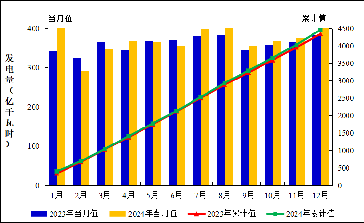 2023年1月至2024年12月全国运行核电机组发电量趋势 中国核能行业协会供图