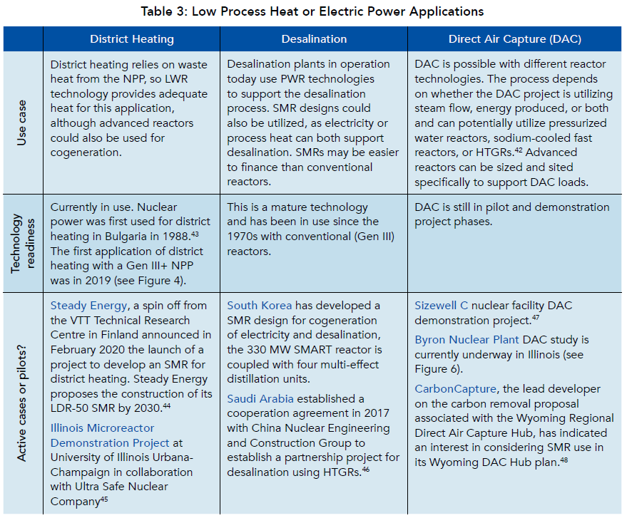下表侧重于电网传统集中式能源发电以外的电力应用。这些用例受益于核电站与最终用途的接近性,所确定的案例代表了未来能源需求快速增长的领域或通过用无碳能源生产取代化石燃料来实现经济中难以脱碳的部门脱碳的机会。