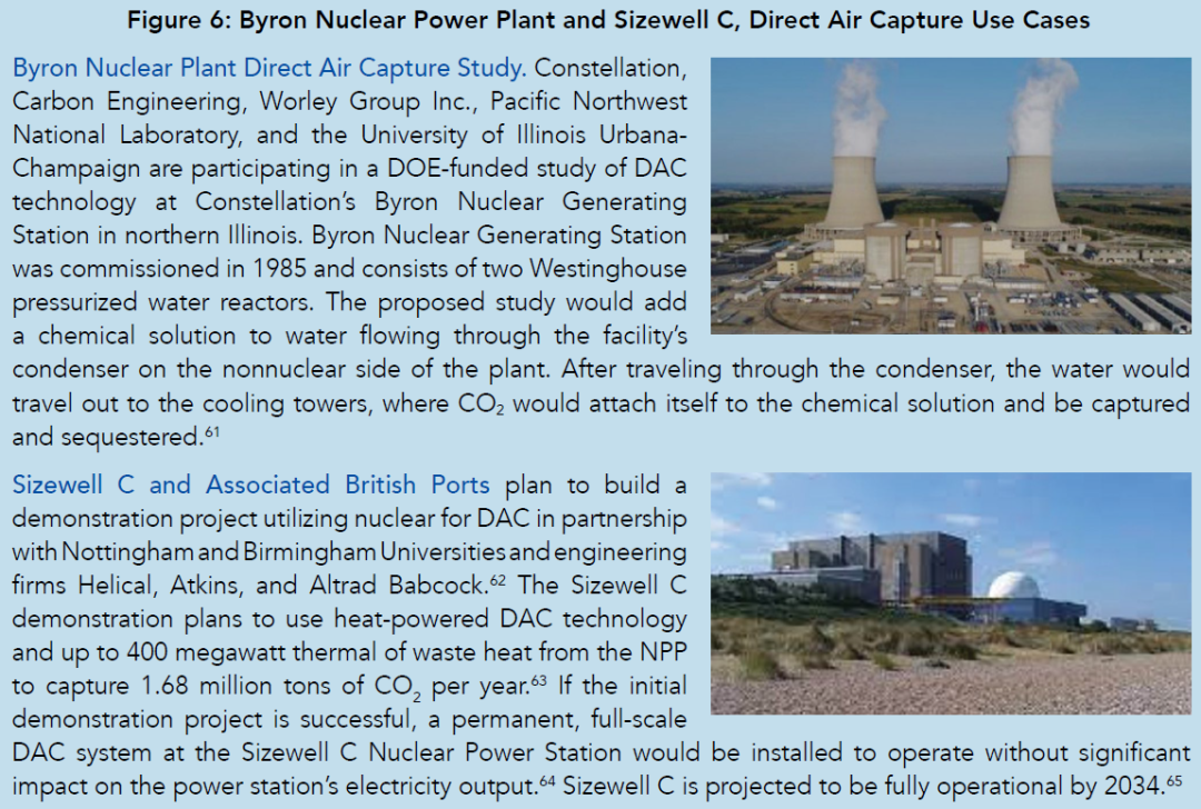 2023 年美国能源部报告《核能支持负排放技术的评估》发现核电站与 DAC 系统兼容,并确定了将核电站与 DAC 结合的以下潜在好处:大量脱碳和恒定输出电力;免费废热或廉价低温热;或高温热。该报告还确定,与非核能 DAC 系统的成本相比,使用核能进行 DAC 可使基于固体吸附剂的 DAC 系统的平准化成本降低约 13%,基于液体溶剂的 DAC 系统的平准化成本降低约 7%。
