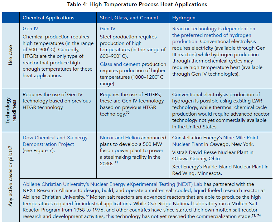 利用先进的核能发电来支持化学品、玻璃、水泥制造和金属生产,为减少这个难以减排的经济部门的排放提供了一个有希望的机会。虽然目前的轻水反应堆能够产生高达 300˚C 的热量(足以用于区域供热和海水淡化目的),但先进核能应用的新概念依赖于第四代核技术承诺的高热量输出,为目前由化石燃料驱动的难以脱碳的行业提供热量。具体来说,这些应用需要高温气体反应堆、气冷快堆或熔盐反应堆技术来产生所需的工艺加热,以减少这些应用的温室气体足迹。