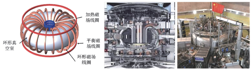 受控核聚变 氢弹是利用氘和氚聚变反应瞬时放出的巨大能量,以杀伤敌方的武器。受控核聚变是氘氚核反应在可控制的条件下,缓慢地进行,使其放出巨大能量供发电使用。受控核聚变的研究已经有七八十年的历史。由于其技术上的复杂性和苛刻要求,至今还在进行之中。理论上,实现受控核聚变的方法有磁约束和惯性约束(激光惯性约束和重离子惯性约束)。目前,磁约束装置主要以托克马克型磁约束装置为主。它利用特殊的环形磁场约束氘氚等离子体,并使其在磁场中循环流动,形成电流环,同时不断被磁场加热(图3)。几个国家都建造了磁约束聚变装置,例如俄罗斯、英国、中国、日本等。多国联合建造的磁约束聚变实验装置ITER 正在进行当中。中国科学院等离子体研究所建造了全超导磁约束聚变装置,在2023 年4 月实现了世界上最长的403s 的稳态长脉冲高约束模式运行。