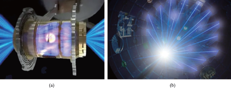 在激光惯性约束研究方面,美国LLNL联合实验室的NIF 装置是一个典型代表(图4)。NIF 采用间接驱动构型。将含有氘和氚混合物核燃料的毫米级靶丸封闭在黑腔中,用192 束激光同时照射黑腔的内壁,产生强烈的X射线,以烧蚀靶丸的外表面,快速喷射出的等离子体反向压缩核燃料,首先使燃料中心的密度和温度达到聚变反应所需,并开始聚变反应。聚变反应会从中心开始向外传播,从而燃烧周围的燃料。经过长期研究,终于在2022 年8 月,利用192 束大功率激光同时照射毫米量级的靶丸,不仅实现了点火,而且也第一次实现了能量输出,但输出的能量只有输入能量的70%。在2022年12 月的实验中,将输出能量与输入能量的比值(能量增益)提高到154%。