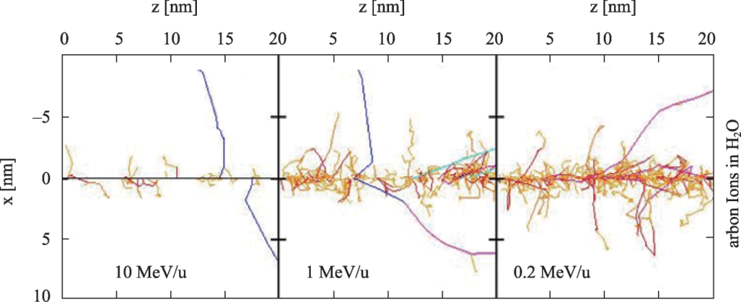 首先,重离子在物质中穿行时可以撞出很多能量很高的电子(图7),而常规射线(X 射线和γ射线),只能撞出很少的低能电子。有一定能量的电子与DNA分子碰撞时,会导致其DNA的单、双链断裂。电子与别的分子,如水分子的碰撞会导致其电离,从而产生自由基,这也是导致DNA双链断裂的因素。实验证明,适当能量的重离子照射细胞时不仅能致使许多细胞内的DNA双链断裂,而且还能够在同一个DNA上产生多处双链断裂。X射线或者γ射线照射时多数是导致DNA的单链断裂,产生双链断裂的几率只是单链断裂的百分之几,且随着X射线能量的升高,这些断裂数还会降低。例如,每个核子能量为2 MeV的碳离子穿过细胞DNA时产生的双链断裂数约是18 MeV的X射线的近百倍。单链断裂几乎都是可以修复的,双链断裂的修复几率则很小,特别是要同时修复多处双链断裂,几乎是不可能的。DNA双链断裂不能修复的结果就是导致细胞的凋亡或死亡。