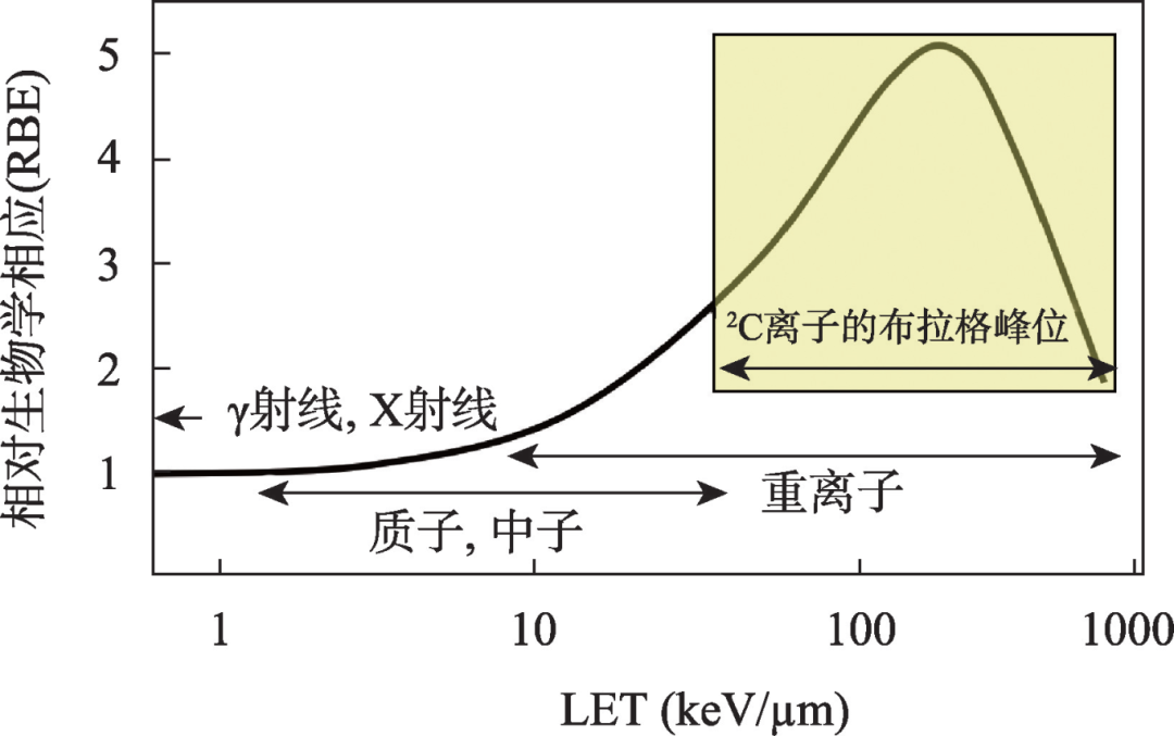 首先,重离子布拉格峰附近的生物学效应大。所谓生物学效应是指与X射线相比而得到的一个指标:同样杀死50%的细胞,利用X射线照射时所需剂量与利用重离子照射所需剂量之比。生物学效应与其单位路径上沉积的能量(LET)有关。实验证明,生物学效应的峰值在LET 在30~200 keV/μm的范围内,在其他LET 时,则很小。高能碳离子穿过人体时的LET小,而在其接近射程末端时的LET要高得多。因此,碳离子的布拉格峰附近,其生物学效应在2.5~3 以上(图11)。这意味着同样杀死50%的细胞,所需重离子的剂量只是X射线剂量的三分之一左右。但是,重离子布拉格峰前的区域(坪区)的生物学效应则接近1。