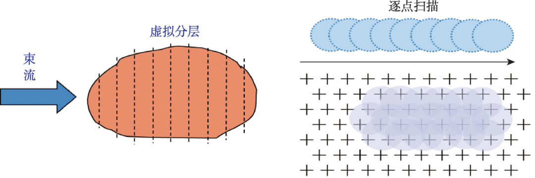 要实现精确扫描照射,首先,加速器要提供较好品质的线状束流,束流斑点的直径约1 mm。根据治疗计划将肿瘤由浅至深虚拟地分割成许多片,每一片对应一个束流能量,每片的厚度接近1 cm。利用磁铁控制束流,依次按照每片的形状进行逐点扫描,且保证剂量的均匀性,直到整个肿瘤扫完为止(图15)。