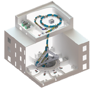 为了进一步减少碳离子治疗对肿瘤周围健康组织和器官的损伤,也可以利用与伽马刀类似的可转动的束流扫描照射方法。德国建造了重达几百吨的旋转机架,用来偏转束流,以便从不同角度对肿瘤进行照射,分散正常组织上受到的剂量(图18)。