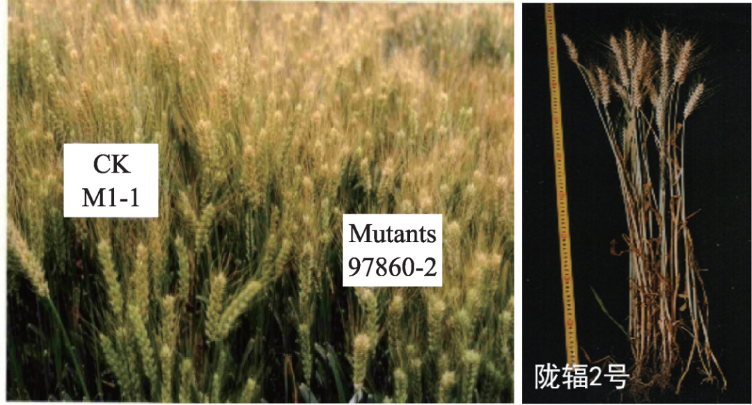 中国科学院近代物理研究所早在2003 年就利用重离子辐照培育了9 个春小麦稳定突变新品系及“陇辐2 号”春小麦优良品种(图25)。该品种适应性广,对条锈病、黄矮病抗性较好。抗倒伏,耐旱、抗干热风。生长期缩短为98~103 天。平均亩产485.2千克。粗蛋白质含量13.0%~17.3%,湿面筋28.3%~39.2%;该品种推广了812万亩。