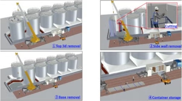 拆解的碎片(顶盖、侧壁、底座、梯子等)将被切割成可装入集装箱的尺寸,并存放在 20 英尺全高集装箱中。装有油箱碎片的集装箱将被移至主存储区。东京电力计划为每个油箱使用约 3.5 个 20 英尺全高集装箱。由于 J9 区域共有 12 个油箱,因此将使用约 42 个集装箱。
