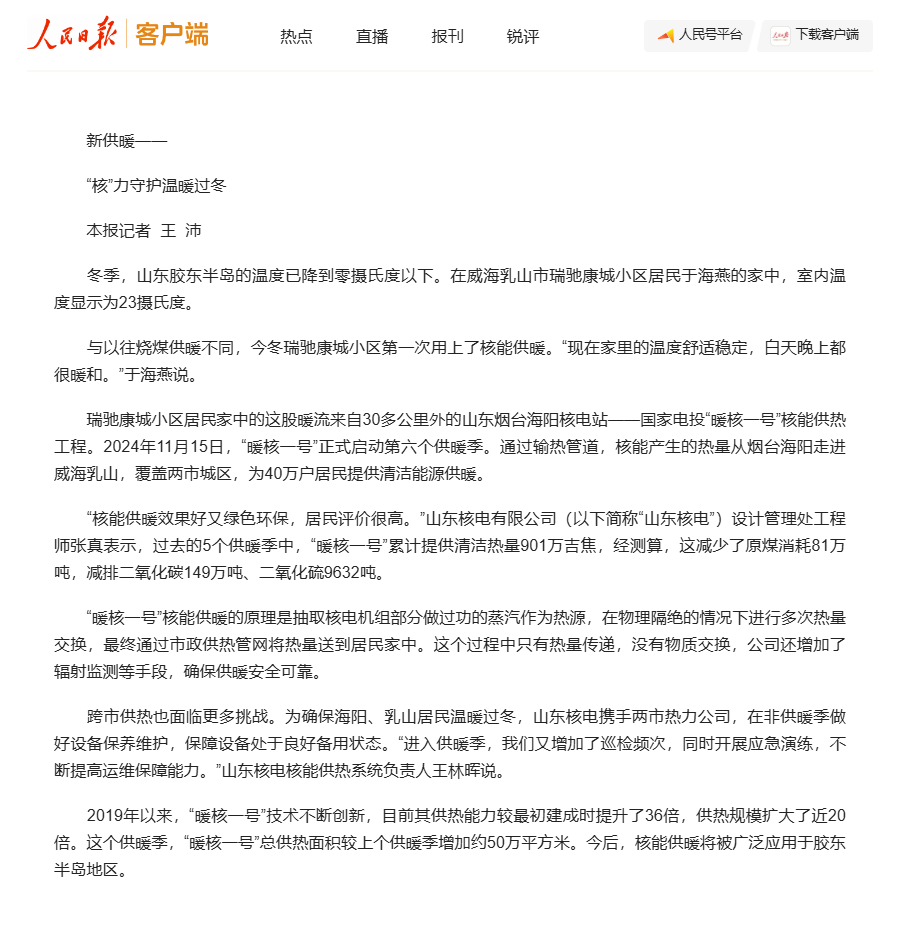 2019年以来,“暖核一号”技术不断创新,如今供热能力较最初建成时提升了36倍,供热规模扩大了近20倍,为核电大规模热电联产提供了良好范本,影响力持续扩大。2025年,“暖核一号”已两次登上人民日报。