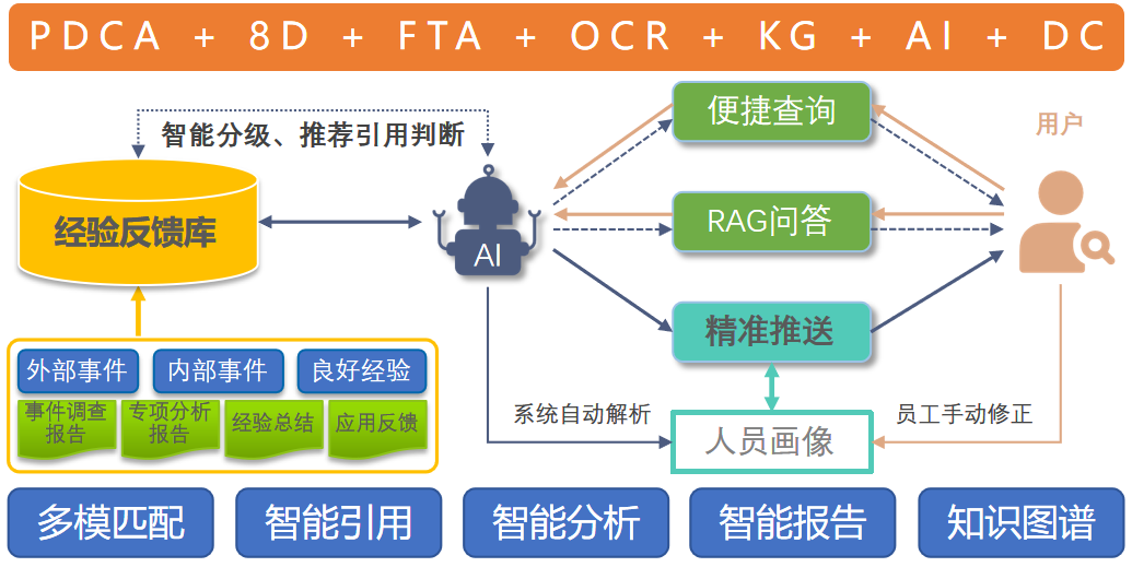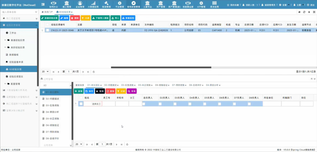 系统以“数据驱动、用户画像、智能推荐、智能报告、智能闭环”为核心,实现从事件上报(含:根据当前人及所在项目、堆型、FCD周期、用户画像、事件类型等多维度数据,系统智能推荐关联经验反馈)、围堵、临时措施、根因分析、预防措施、效果验证、评估总结,共享分发、反馈落实、学习和关闭、效果评价等全周期经验反馈活动管理的全链路闭环,赋能核电群堆建造的施工管理能力和支撑后续项目的筹备能力。
