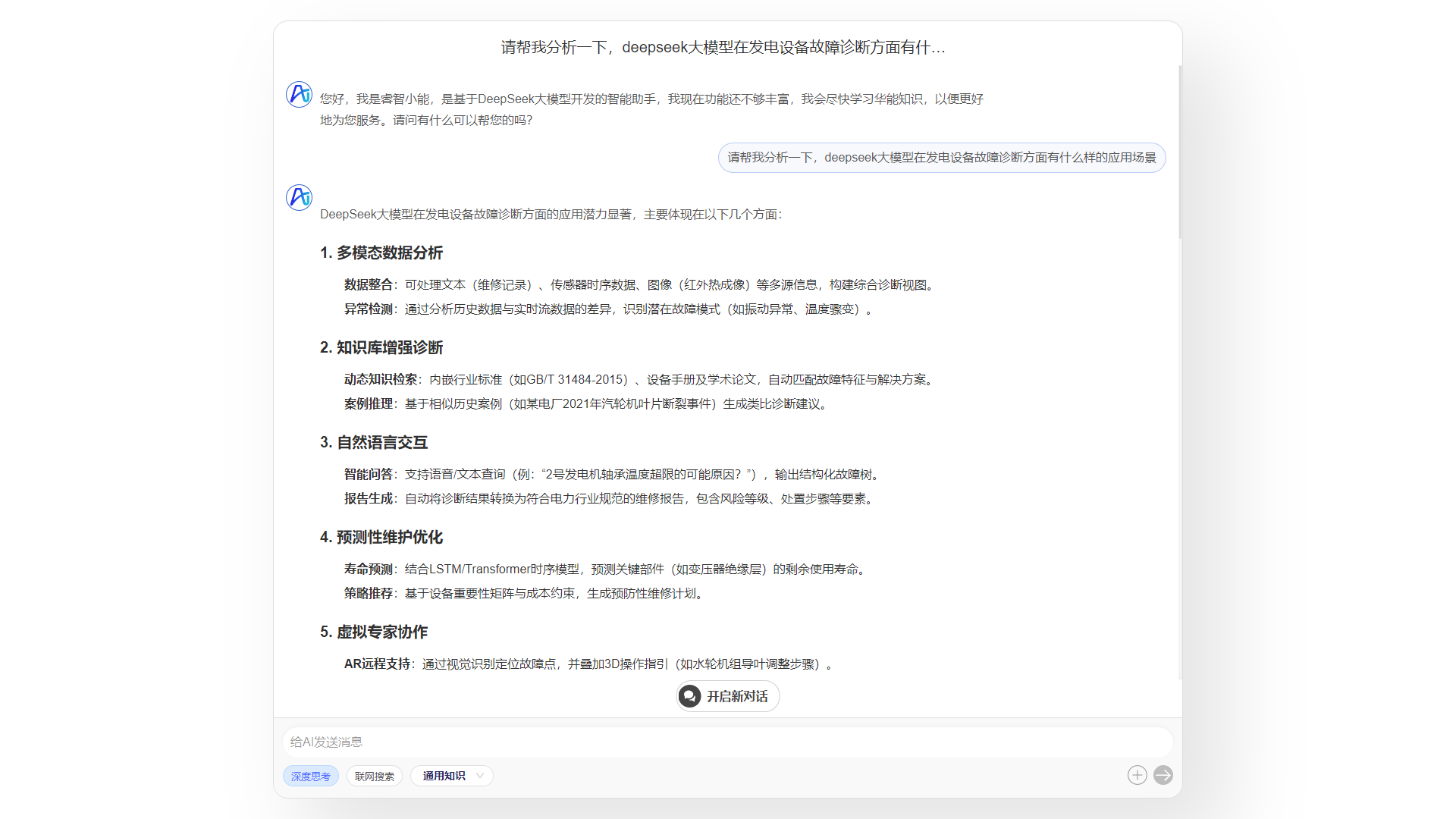 同时,中国华能还在持续推进“睿智小能”与各产业业务系统的深度集成与智能体研发,赋能业务核心场景。如电力生产控制方面,将工业过程温度控制系统与AI助手相结合,保证温度精准控制与快速响应,并根据历史数据给出控制参数建议等;设备检修指导方面,构建电力设备私有化知识库,与设备管理、缺陷管理等功能集成,实现设备故障智能排查、检修问答与指导;智能招采方面,适配DeepSeek开展招标文件审查、投标文件清标、投标文件相似度及作者一致性检查、评标报告生成等功能的深化应用,进一步提升招采质效。