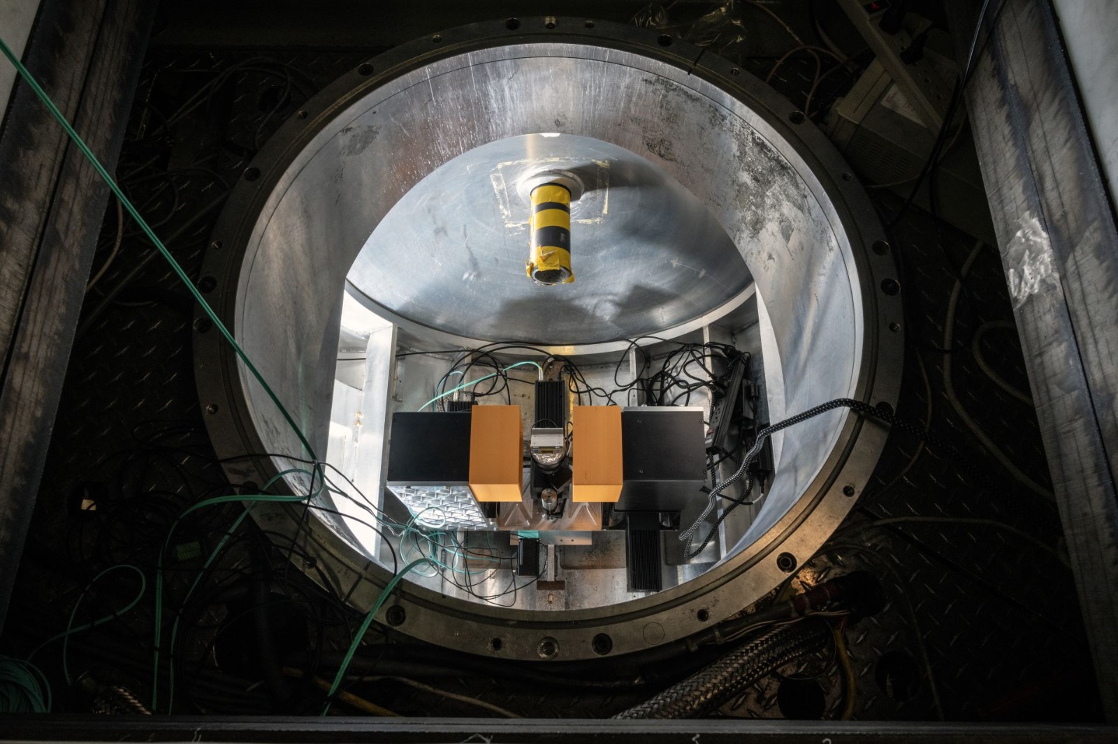 卢汉中心飞行路径 4 (HIPPO) 的俯视图,可以看到探测器室内装有 1,200 多个氦-3 中子探测器(此处不可见)。最近,研究人员在该飞行路径上安装了一种先进的中子成像系统,称为 LumaCam,以便同时进行飞行时间中子衍射和能量分辨中子成像。除了以透射模式运行的 LumaCam 进行成像外,研究人员还在探索将这些系统用于衍射模式,作为氦-3 探测器的潜在替代品,为中子散射飞行路径能力的创新进步铺平道路,并增强 HIPPO 在尖端材料研究中的多功能性。(照片:LANL)