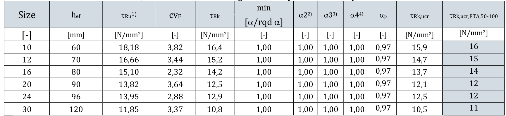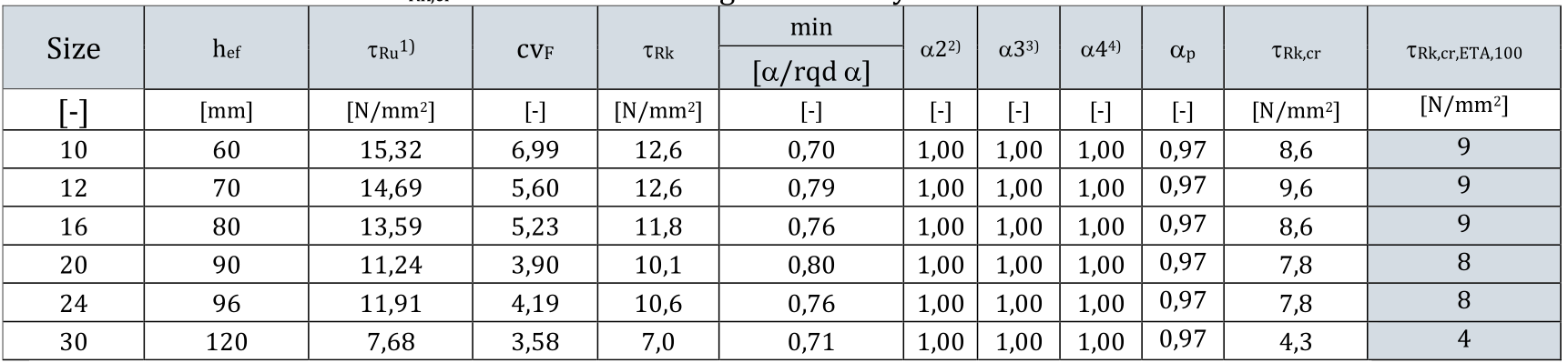 ②、欧洲100年耐久性评估(特征抗拉强度,开裂混凝土),由欧洲ETA机构依据EAD 330499-01-0601标准出具。使用不同型号的螺杆进行配合测试,在-40ºC到+60ºC的服务温度范围内,通过模拟加速老化实验来模拟100年的使用寿命情况,以测试拔出失效时的特征抗拉强度,从而评估其耐久性。