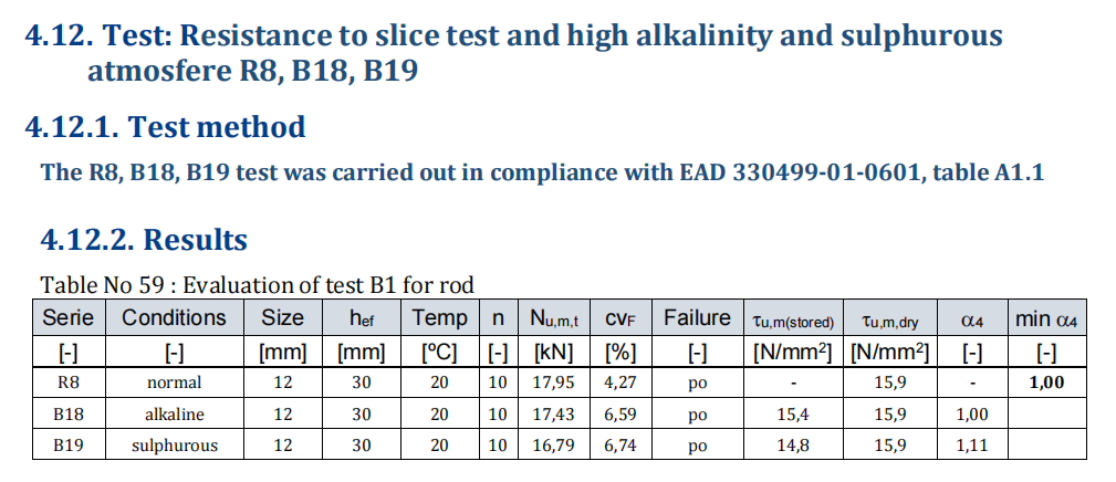 ④、欧洲100年耐久性评估(耐高酸碱性腐蚀),由欧洲ETA机构依据EAD 330499-01-0601标准出具。检测报告显示,MT500植筋胶呈现出卓越的耐酸碱特性,在复杂环境中展现出独特适配性,能有效抵御外界腐蚀和侵蚀,确保结构长期稳定。