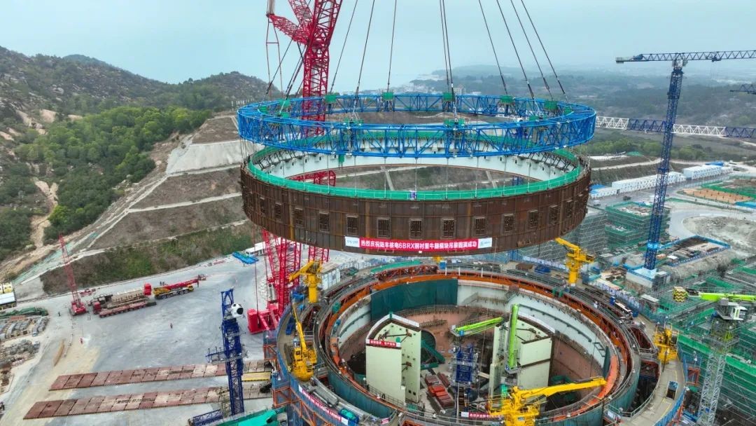 2025年3月2日,陆丰核电6号机组核岛安全壳钢衬里牛腿模块经起钩、悬停、回转、带载行走、落钩、就位、调整等一系列标准化动作精准实施后,历时2小时40分钟顺利吊装就位。