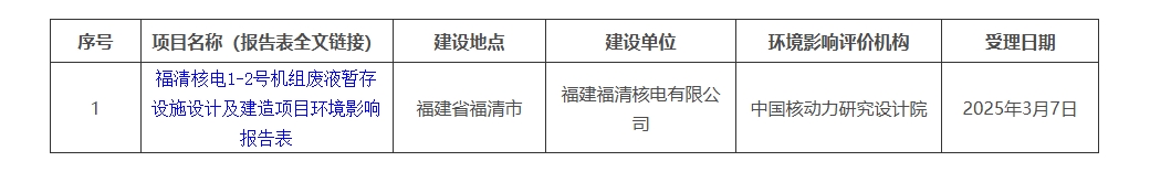 根据建设项目环境影响评价审批程序的有关规定,2025年3月7日我部共受理1个核与辐射建设项目环境影响评价文件。现将受理情况予以公示,公示期为2025年3月17日—2024年3月21日(5个工作日)。