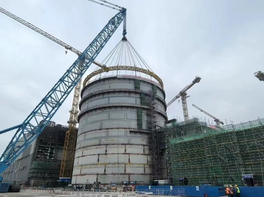 5月25日7时48分,三门核电4号机组核岛屏蔽厂房墙体钢板混凝土结构(SC)第13-14层模块吊装就位,为4号机组安全壳顶封头就位里程碑节点实现打下基础。
