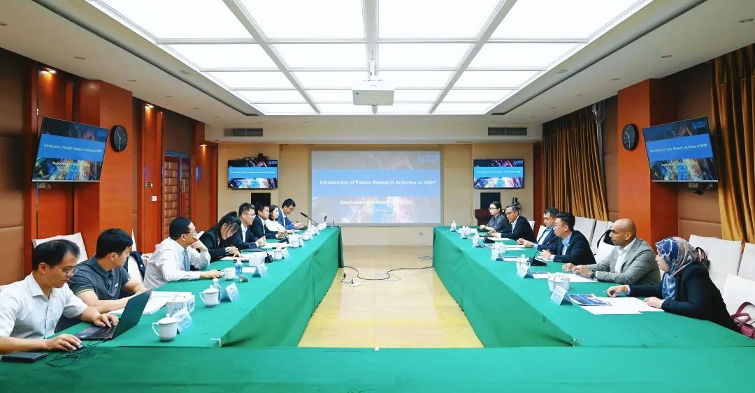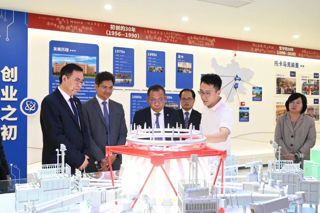 会议期间,多国代表团先后赴西物院参观访问,深入新一代人造太阳“中国环流三号”装置现场,详细了解聚变科研进展。6月 10 日,印尼国家研究与创新署(BRIN)主席拉克萨纳・特里・翰多科率团到访西物院,并听取了西物院近期取得的重大科技创新成果汇报。次日上午,马来西亚国油科技大学校长穆罕默德·菲鲁兹·阿兹南先生一行赴西物院参观,双方就聚变人才培养、聚变装置建设等合作内容展开深入交流,为中马聚变合作从概念构想迈向落地实施奠定坚实基础。6月12日,马来西亚科技与创新部部长郑立慷、泰国高等教育科学研究与创新部副部长苏帕差·杰穆分别率团赴西物院参观,围绕磁约束聚变能领域人才培养、联合科研攻关、技术交流合作机制进行座谈交流,并就进一步加强协同创新、推动能源技术发展交换了意见。