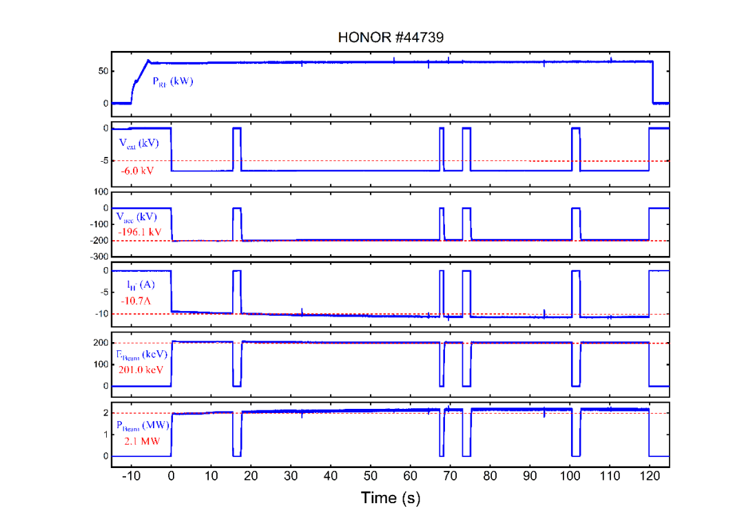 7月5日,等离子体所组织召开工艺测试暨工艺验收会,邀请来自中国科学技术大学、中电集团38所、北京大学、合肥工业大学的5位专家组成专家组。专家组听取了NNBI系统负责人的项目工艺总结报告,审阅了自测试报告等相关文档,并亲赴负离子源中性束注入实验室开展现场测试。在专家组的见证下,系统顺利达到了束能量202.1keV、束脉宽120s、束功率2.1MW的参数指标。测试结果表明,该系统各项指标均达到了验收要求,总体性能达到国际先进水平。