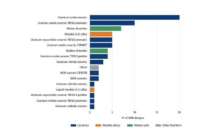 报告补充道:“小型模块化反应堆(SMR)设计基于日益多样化的燃料形式,其中大多数尚未获得许可或合格使用。氧化铀陶瓷是当今商用反应堆中最常见的燃料。然而,创新的SMR设计正在引入各种新型燃料,这些燃料需要不同的制造工艺和技术。标准氧化铀陶瓷燃料是正在积极开发的SMR技术中最常见的燃料,有39种SMR技术计划使用它作为燃料。在这39种设计中,有19种采用或计划采用复合燃料结构,例如TRISO,这与当今大型轻水反应堆中使用的传统燃料有所区别,并可能显著改变燃料制造要求和性能特征。更广泛地说,47种SMR设计(占本版仪表板中超过60%)依赖于目前尚无法实现商业规模的燃料形式。”