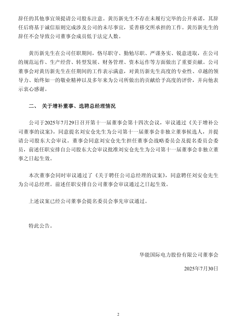 7月30日,华能国际发布公告称,公司董事、总经理黄历新先生因工作调整,于近日依据有关规定向公司董事会提交了书面辞职报告,申请辞去公司董事、总经理以及董事会战略委员会和提名委员会委员职务。