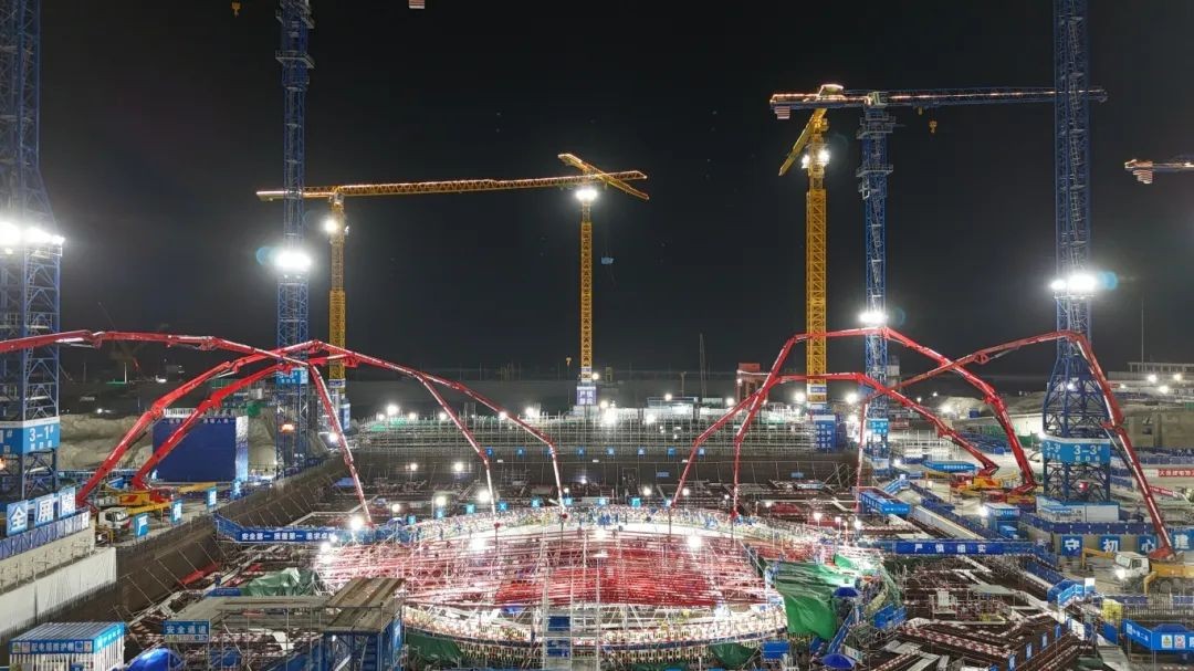 在本次浇筑过程中,项目大团队经过精密策划,创新性地将周边厂房筏基分区由一期的8个精炼为5个,大幅减少施工缝处理时间,提高整体效率。同时在FCD准备期间,优化浇筑站位布局,将设备精简为6台汽车泵并科学布置于筏基外围,有效规避了与核岛主体施工的交叉干扰。