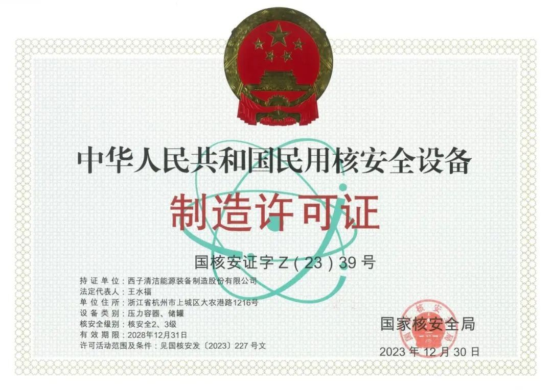 技术的沉淀终成跨越的底气。自2011 年国家核安全局受理取证申请起,公司历经 8 年审核 —— 从文件澄清、模拟件制作到现场审核,全公司协同攻坚,于2018年成功获颁“民用核安全设备制造许可证(核2、3级压力容器、储罐、热交换器)”,成为当时浙江省唯一获此资质的大型上市企业。这张国家特别许可颁发的证书,不仅是对公司管理水平与制造实力的认可,更让西子洁能正式叩开核岛设备制造的大门。