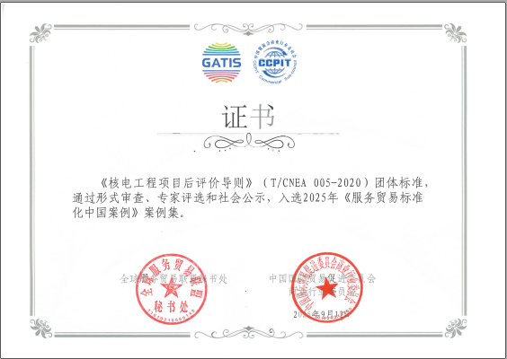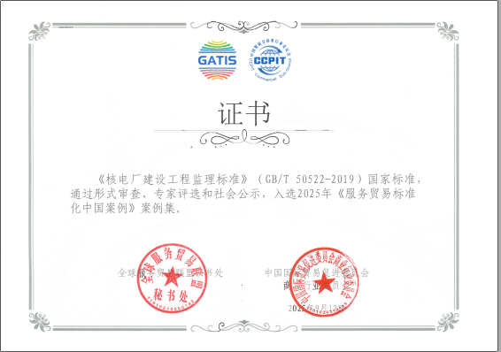全球服务贸易联盟秘书处联合中国贸促会商业行业委员会发布2025年《服务贸易标准化中国案例》,中核咨询主编的国家标准《核电厂建设工程监理标准》及团体标准《核电工程项目后评价导则》成功入选。作为核工业咨询服务领域唯一入选单位,充分展现了中核咨询在核工业服务贸易标准化体系建设中的行业引领地位与示范价值。