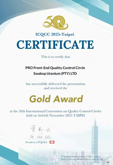 本次获奖是斯科公司在前期获得纳米比亚政府质量奖第一名后,在质量管理领域取得的又一重要国际荣誉,是在中广核集团和中广核铀业公司指导下实现质保体系有效性提升的具体成果,将为斯科公司实现更高质量、更可持续的发展以及世界一流矿山建设奠定坚实的基础。