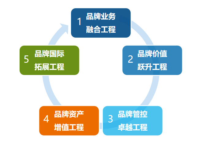 推进品牌业务融合工程,深入推动品牌战略与企业发展战略一体部署,促进品牌与业务相互赋能。推进品牌价值跃升工程,强化创新驱动,大力推进科研、技术、安全与品牌创新协同联动,深化国内外履责担当,持续提升品牌竞争力。推进品牌管控卓越工程,持续完善品牌架构模式,进一步强化运营管理,不断增强集团品牌管控力。推进品牌资产增值工程,强化品牌资产管理,定期开展资产评估,以品牌标准化培育,提升各类品牌资产的市场竞争与战略引领能力。推进品牌国际拓展工程,分梯次、有层次推进品牌国际化布局,提高品牌国际化运营能力,强化品牌跨文化融合,提升品牌国际影响力。