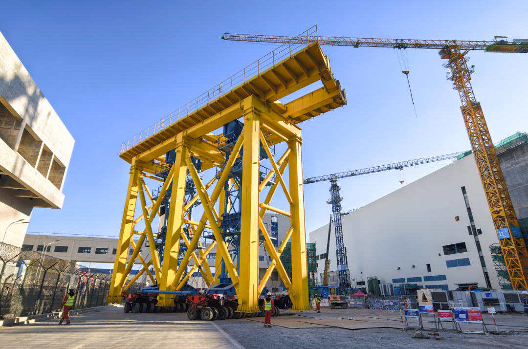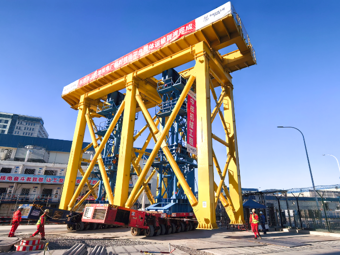 这一关键任务的成功落地,不仅标志着项目部在大件设备运输领域的技术攻坚取得关键胜利,更开创性地填补了公司该类新工艺应用的空白,实现了龙门架转运平台整体一次性运输,避免了整体拆卸、运输和二次组装,提高了施工效率,有效降低了作业风险和施工成本,彰显出中核机械工程在大件吊装运输领域的硬核技术实力。