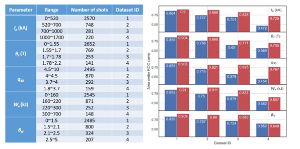 研究团队将中国环流三号(HL-3)托卡马克的数据按照等离子体电流、环向磁场、安全因子、储能、比压进行了切分,在低参数等离子体放电数据(1号数据集)上训练算法,并逐个测试模型在高参数数据(2~4)号数据集上的表现,发现参数预演神经网络(红色柱)的性能明显由于传统的破裂预测方案(蓝色柱)。