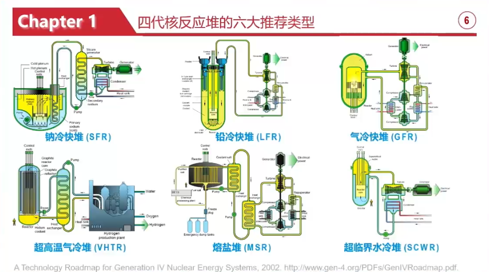 涂善东院士表示:第四代核能系统的设计挑战, 目前推荐的有六种类型。分别是钠冷快堆(SFR),铅冷快堆(LFR),气冷快堆(GFR),超高温气冷堆(VHTR),熔盐堆(MSR),超临界水冷堆(SCWR)