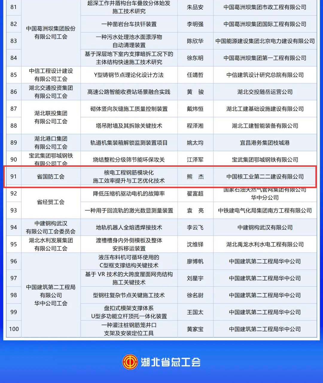 近日,从湖北省总工会获悉,中核二二研发成果“核电工程钢筋模块化施工效率提升与工艺优化技术”作为省国防工会唯一推荐项目获评2025年全省职工百优“五小”创新大赛优秀成果。