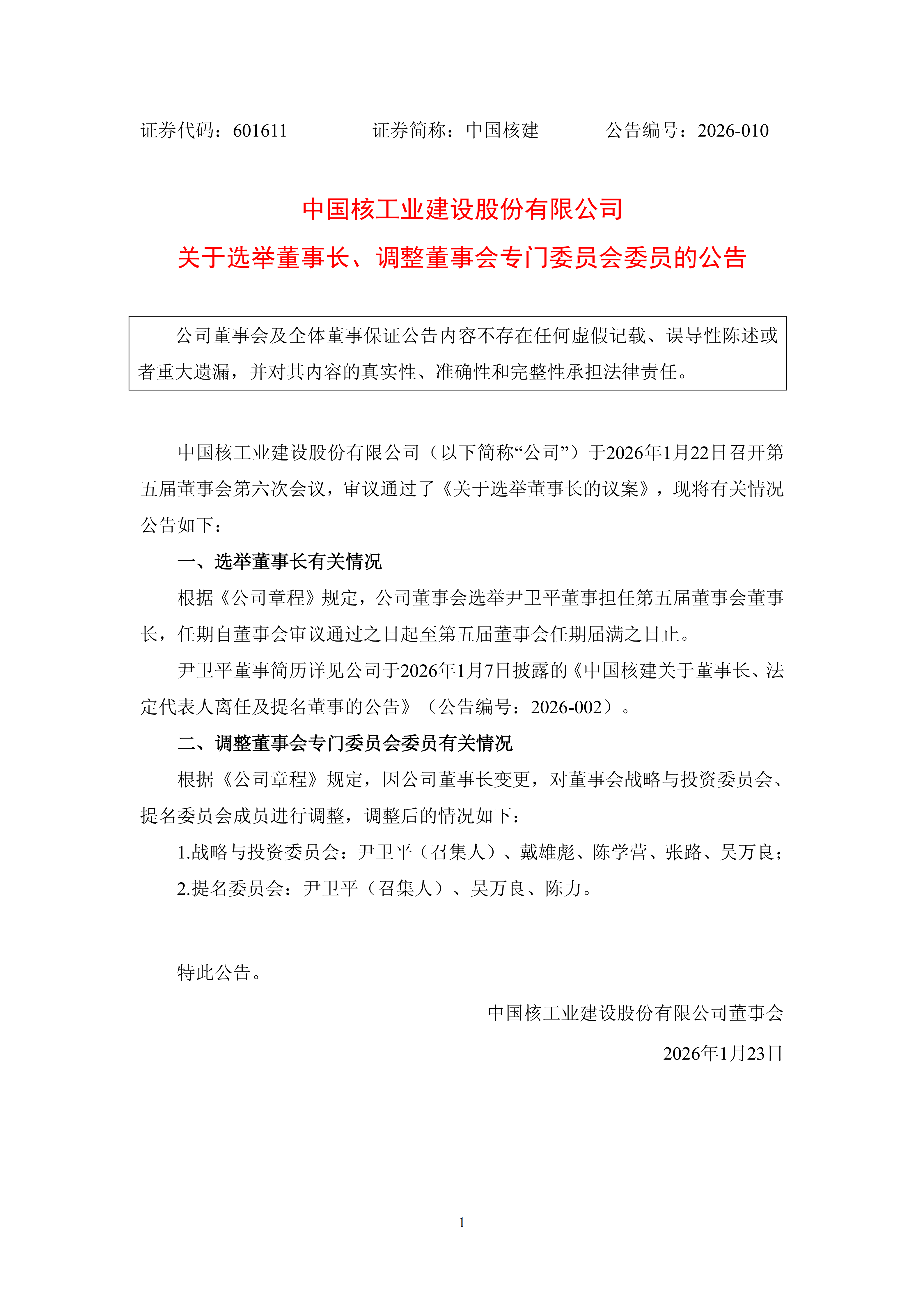 1月22日,中国核工业建设股份有限公司(以下简称“公司”)公告称,公司于2026年1月22日以现场方式召开第五届董事会第六次会议,审议通过了《关于选举董事长的议案》。