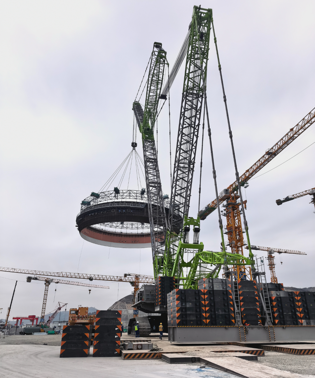 16时16分,随着现场吊装指令下达,2000吨履带吊平稳起钩,现场采用警戒分区标准化管理,项目团队全体成员与各协作单位紧密配合、有序联动。
