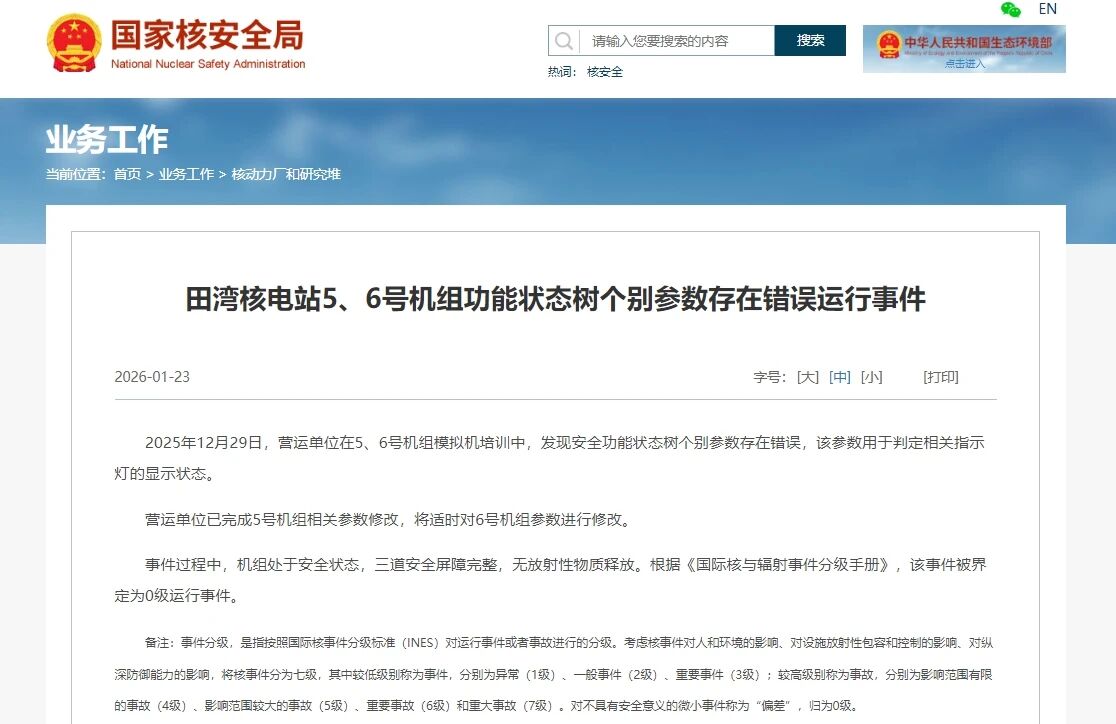 事件过程中,机组处于安全状态,三道安全屏障完整,无放射性物质释放。根据《国际核与辐射事件分级手册》,该事件被界定为0级运行事件。