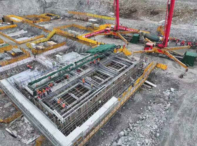 该筏基是公司在中广核核电项目中承接的首个涉核子项。施工面临基坑深、作业面狭窄、排水困难,以及场地多次移交、工期紧张且与负挖出渣交叉作业等多重挑战。为确保浇筑作业安全有序推进,在公司党委及核电事业部的统筹指导下,宁德核电项目部实施了系统性的前期策划与周密部署,采取分批浇筑模式完成本次施工。