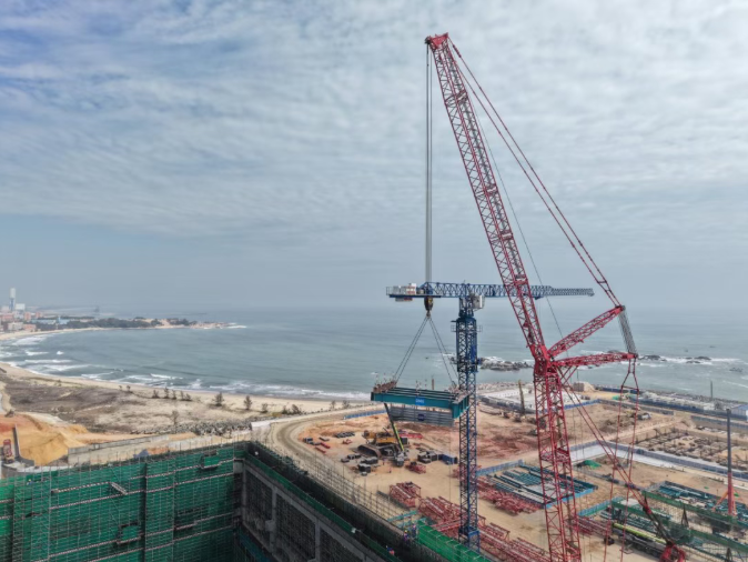 1号机组常规岛6个“钢结构+机电模块”最大吊装重量39.9吨、最大起吊高度70米、最大吊距44米、极限就位精度25毫米,吊装工况复杂。项目团队通过周密组织、高效协同,克服就位空间有限、高空对位难度大等困难,实现所有模块一次平稳、精准就位。