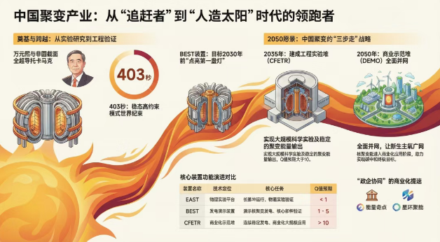 中国在这一领域的探索不仅是一部技术追赶史,更是一部由顶尖科学家引领、国家战略驱动、市场力量参与的宏大史诗。以万元熙院士为代表的老一辈科学家,在极端困难的条件下,通过自主创新奠定了中国超导托卡马克的技术根基;以全超导托卡马克核聚变实验装置(EAST)为核心的大科学装置群,则让中国在磁约束聚变物理研究上实现了从“跟跑”到“并跑”再到“局部领跑”的跨越。进入21世纪第三个十年,随着高温超导材料、人工智能以及精密制造技术的突破,中国核聚变产业正经历从实验室迈向工程化、商业化的历史性转折,形成了“国家队”持续领航、商业公司异军突起、产业链生态日趋完善的崭新格局。