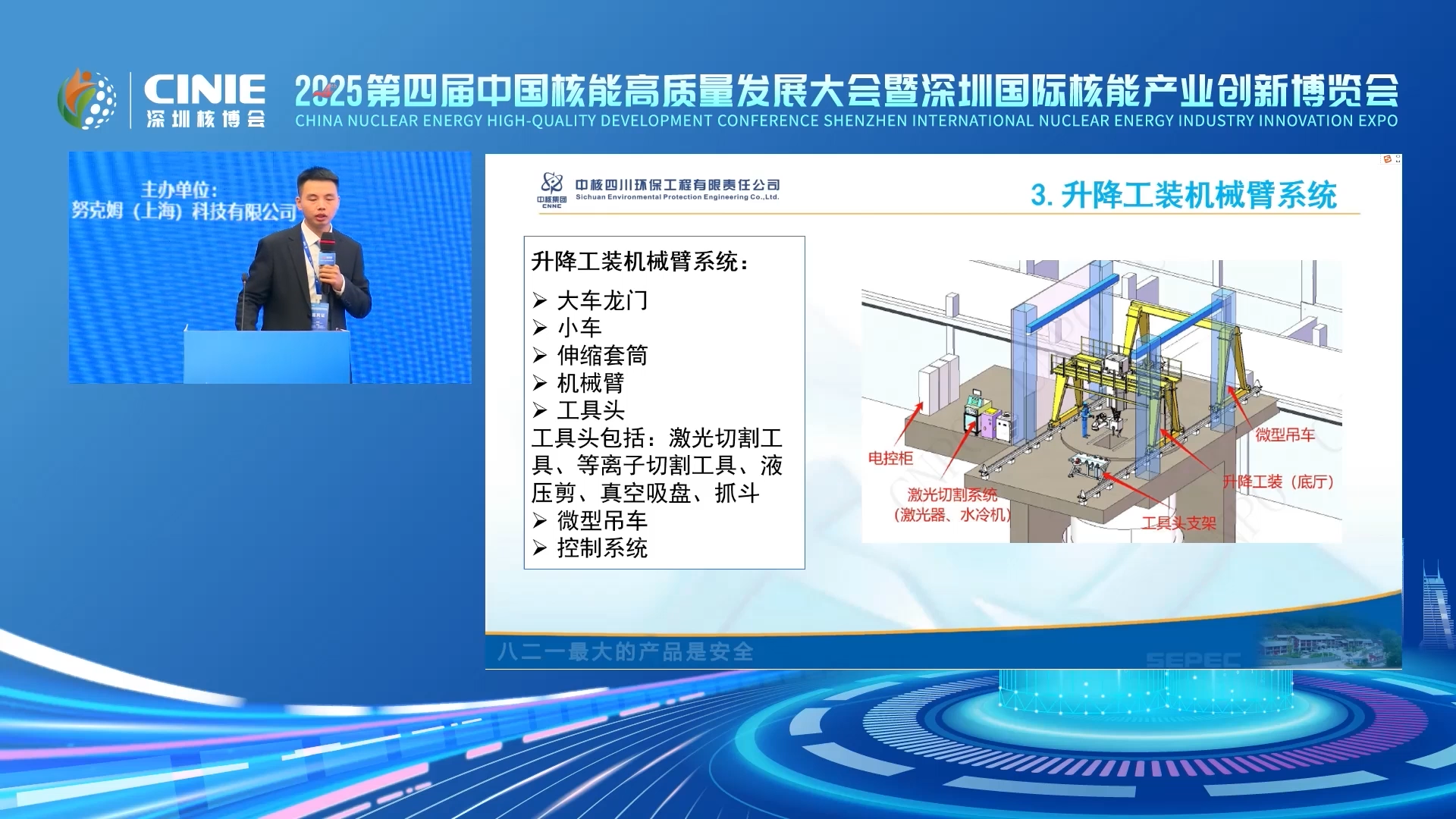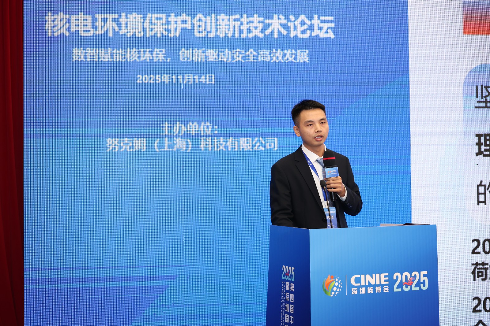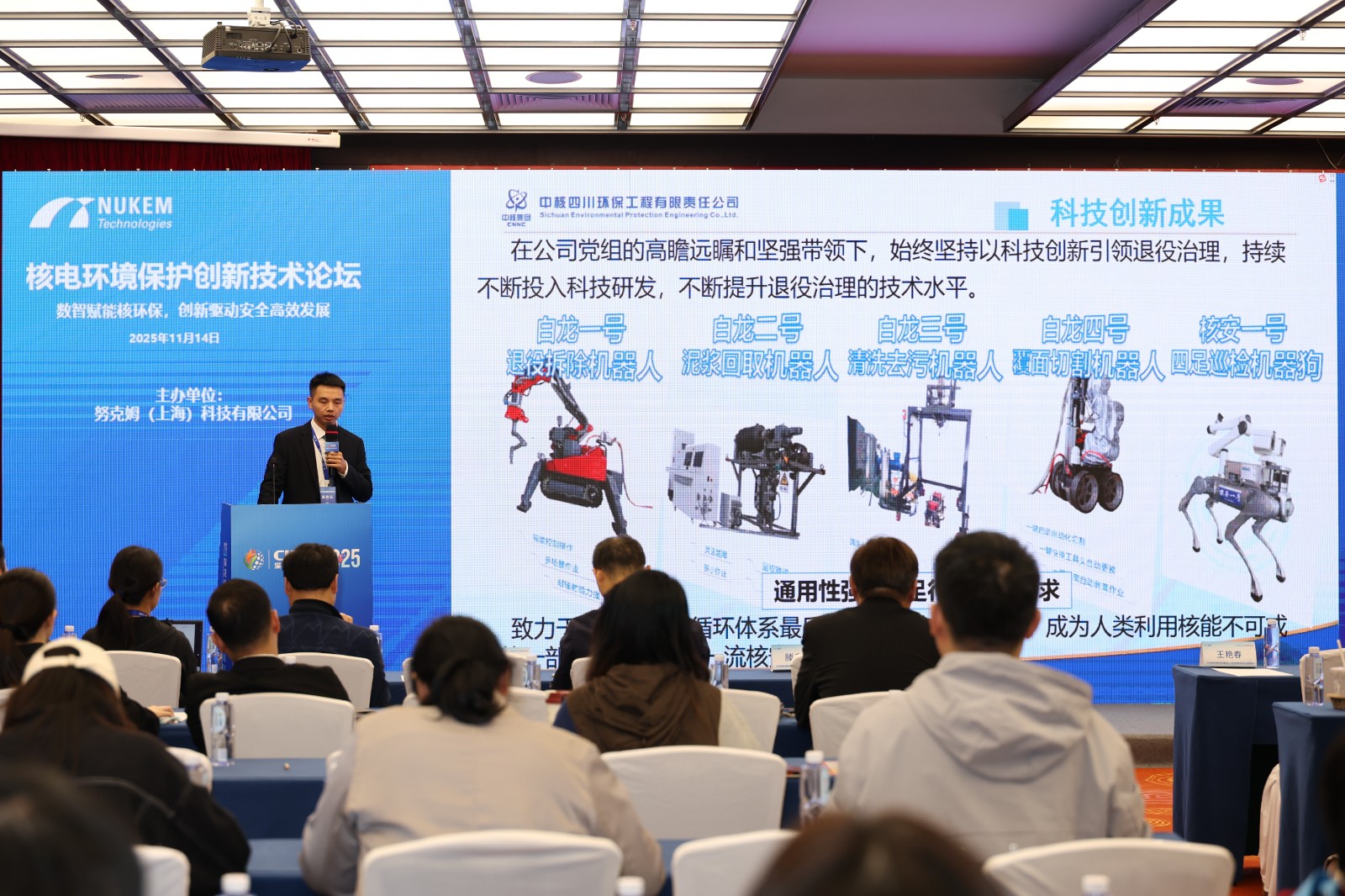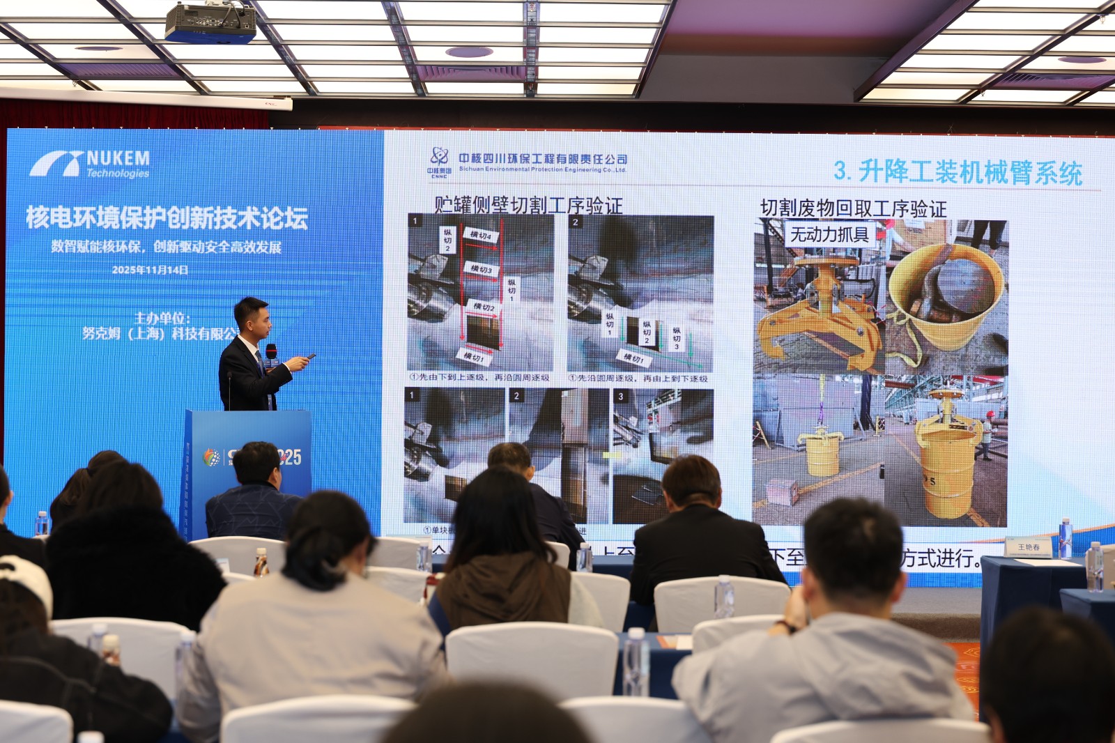 2025年11月14日,中核四川环保工程有限责任公司固体放射性废物处理及退役科研团队负责人傅杰在深圳核博会核电环境保护创新技术论坛发表《退役治理科技创新引领与实践 大型贮罐沉积物回取和贮罐拆除技术》主旨报告。