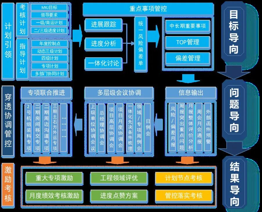 聚焦目标导向,依托一体化进度管控组,统一项目各方目标,以里程碑节点为重点目标驱动制定符合项目实际的“点—线—面”计划,统一项目三级、年度、专项计划目标。聚焦问题导向,按照“策划制定计划—偏差风险识别—问题协调解决”方式开展工作,建立清单式问题处理机制,将每月三级进度计划全盘扫描和每周土建偏差分析相结合,提炼中长期关注项,推动设计和采购问题解决。聚焦结果导向,通过运作内外部激励机制和考核扣罚机制,推动漳州核电工程建设目标高质量实现。