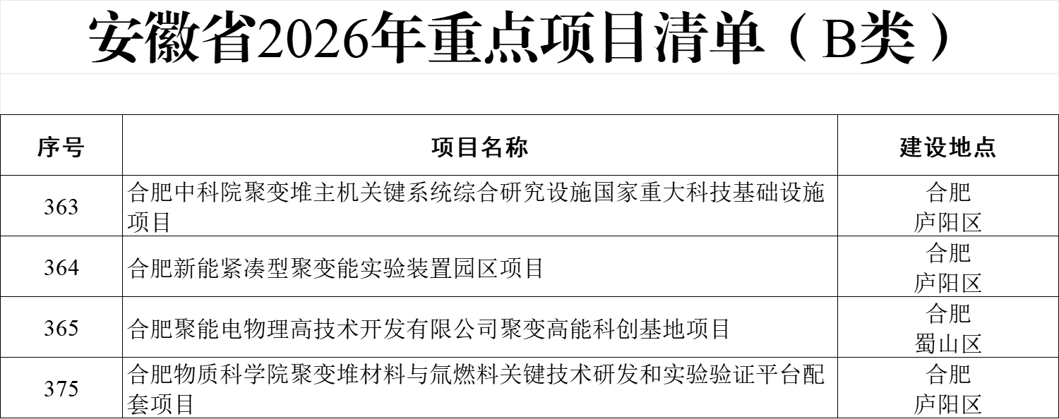 3月16日,安徽省人民政府网站发布《安徽省2026年重点项目清单》,共有488个A类项目、1318个B类项目。其中,“合肥中科院聚变堆主机关键系统综合研究设施国家重大科技基础设施项目”等4个聚变能相关项目入选省级B类重点项目。