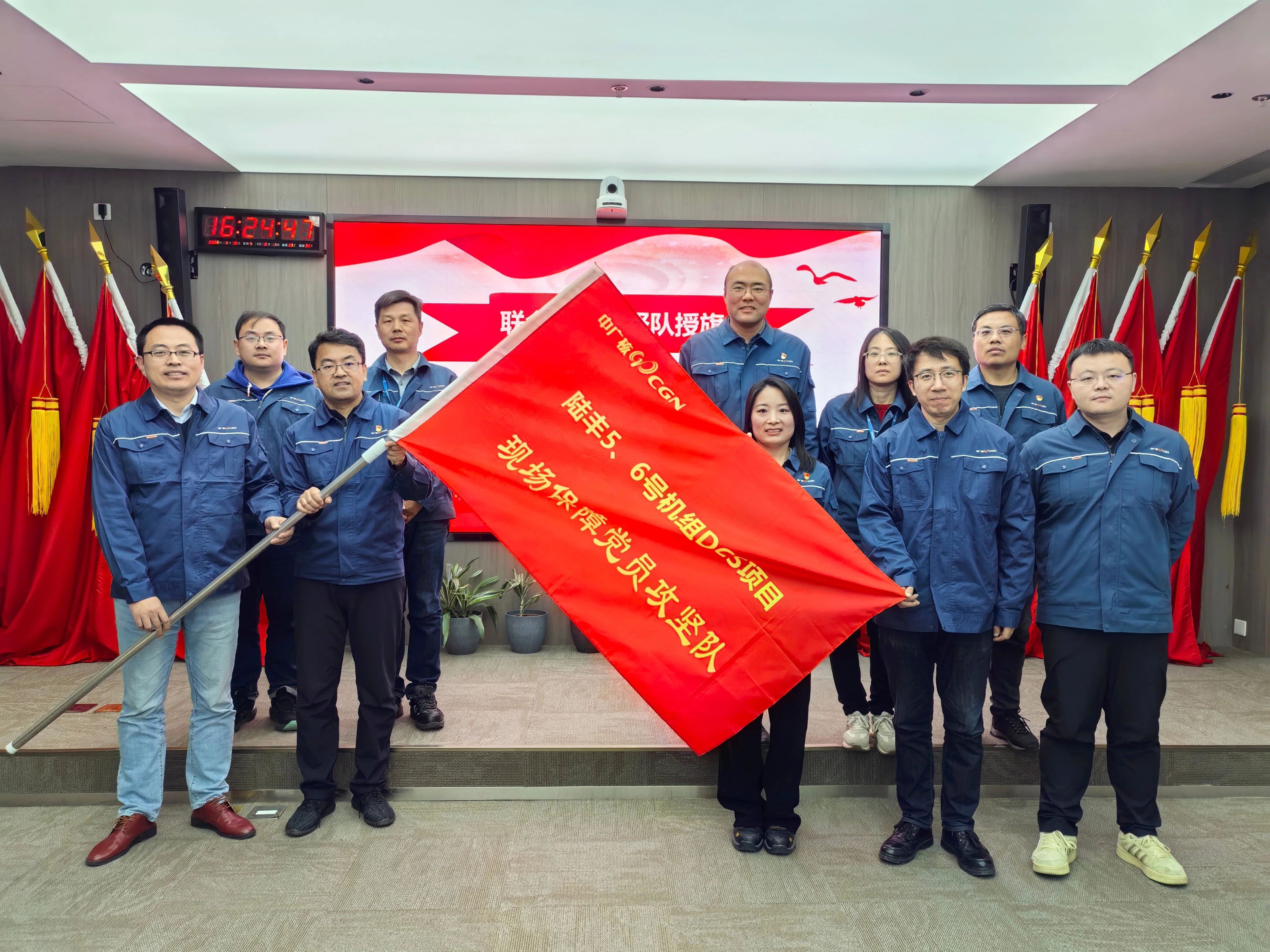 发运仪式上,项目负责人首先对陆丰核电站6号机组DCS项目的整体推进情况作了全面总结,回顾了项目攻坚的全过程、各关键节点的落地成效,以及六大控制目标的完成情况,全方位展示了项目全周期精细化管理的实践成果。现场,广利核公司与中广核工程共同成立“DCS现场保障联合党员攻坚队”,广利核公司党委委员、副总经理裴红伟,中广核工程仪控技术分部副经理张国庆共同为攻坚队授旗,以党建引领凝聚一线攻坚力量,鼓励团队后续在现场建设中勇担使命、冲锋在前。