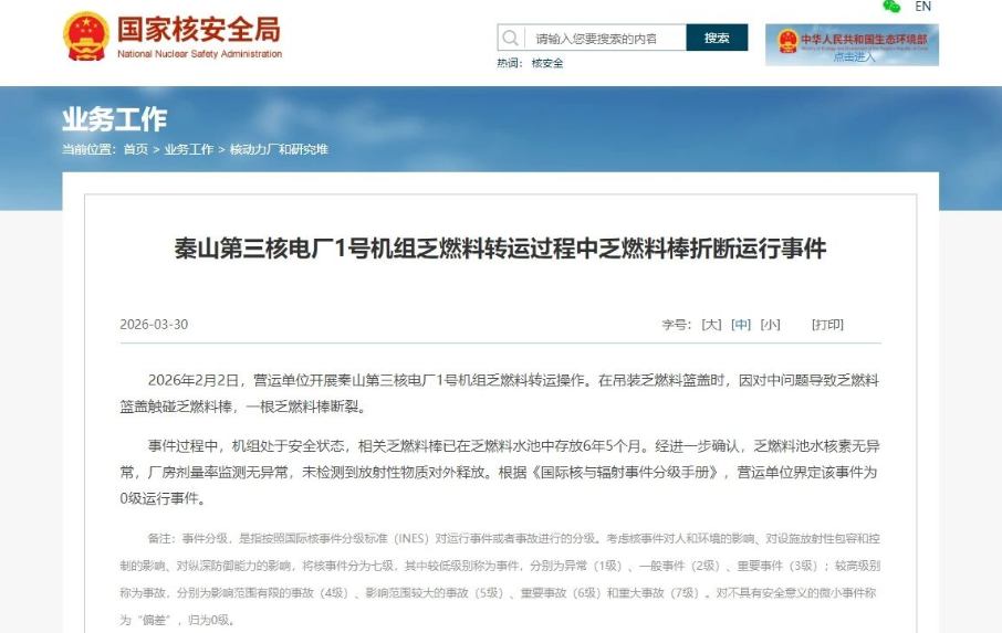 2026年2月2日,营运单位开展秦山第三核电厂1号机组乏燃料转运操作。在吊装乏燃料篮盖时,因对中问题导致乏燃料篮盖触碰乏燃料棒,一根乏燃料棒断裂。