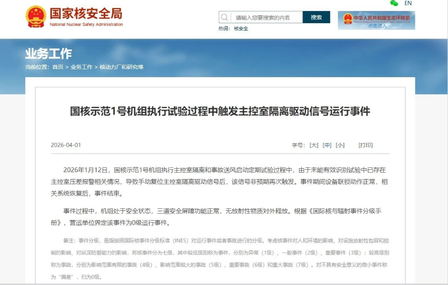 2026年1月12日,国核示范1号机组执行主控室隔离和事故送风启动定期试验过程中,由于未能有效识别试验中已存在主控室压差报警相关情况,导致手动复位主控室隔离驱动信号后,该信号非预期再次触发。事件期间设备联锁动作正常,相关系统恢复后,事件结束。