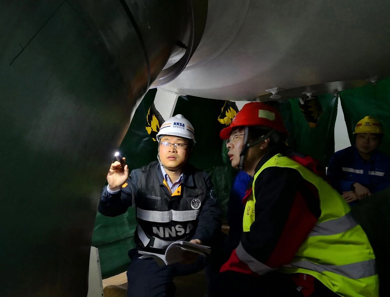 现场监督员在狭小黑暗空间内,对“华龙一号”全球首堆福清核电厂5号机组的主管道焊接施工现场进行检查。
