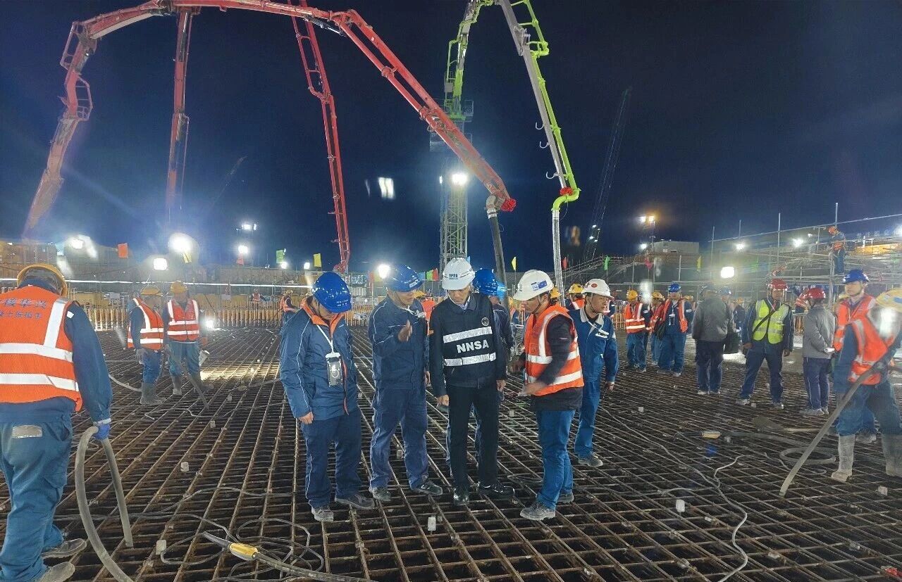 2025年12月17日,现场监督员对宁德核电厂6号机组核岛基础浇筑第一罐混凝土(FCD)开展检查。